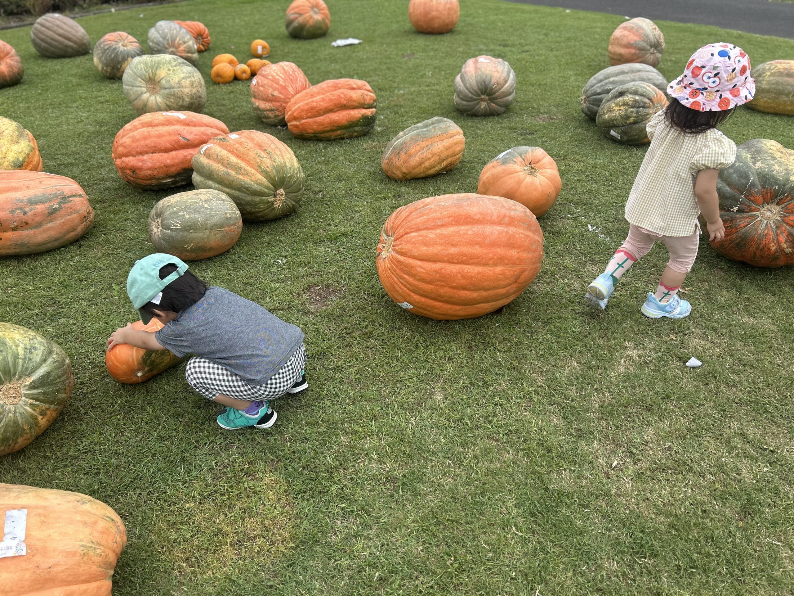 2歳の双子にとって、こんなにも大きなカボチャを見るのは初めて。一番喜んでいたスポットです。
